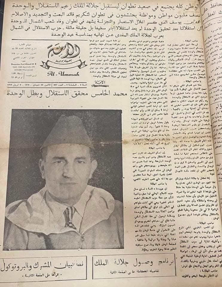 من بين المقالات الاكثر رمزية، ما نشرته “الامة” حول زيارة جلالة الملك محمد الخامس الى تطوان بعد شهر من اعلان الاستقلال. وقد جاء عنوان الجريدة واضحا: